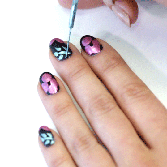 index and ring fingers. On the remaining fingers, add half petals to the tips of the nails. Next,